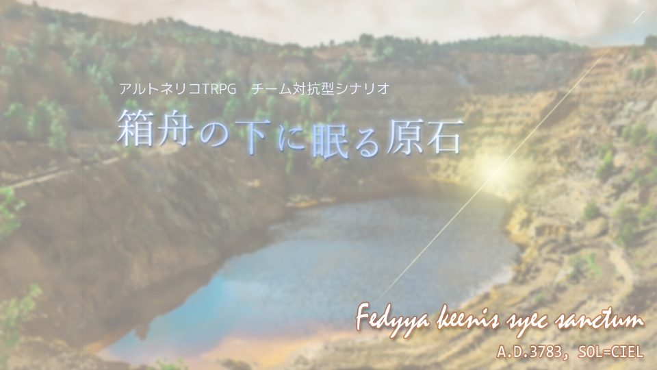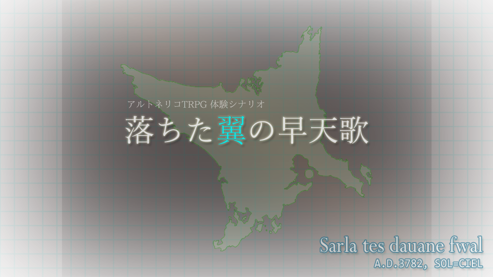 トップページ シナリオ コスモスフィアキャンペーン 青の地平のトーラ <EL=ELEMIA LANDFALL> アルトネリコTRPG体験シナリオ 落ちた翼の早天歌 ダンジョン探索シナリオ 目覚める翼と地下戦争 チーム対抗型シナリオ 箱舟の下に眠る原石 <PROJECT E=B> 探索+緑魔法シナリオ 三つの匣の外側に <TERU-TRIBE PERSPECTIVE> テル族限定シナリオ 懐かしき未踏の森で <OTHERS> バトルキャンペーン 集うは御子の旗の下 アルトネリコTRPG 戦闘体験卓 アルトネリコTRPG情報 アルトネリコTRPGについてシナリオ一覧GM向け資料 設定資料 公式設定参考資料独自設定関連資料 その他・外部関係 他GMの卓に出したキャラクターリンク集 2024-01-30 | yk_lja