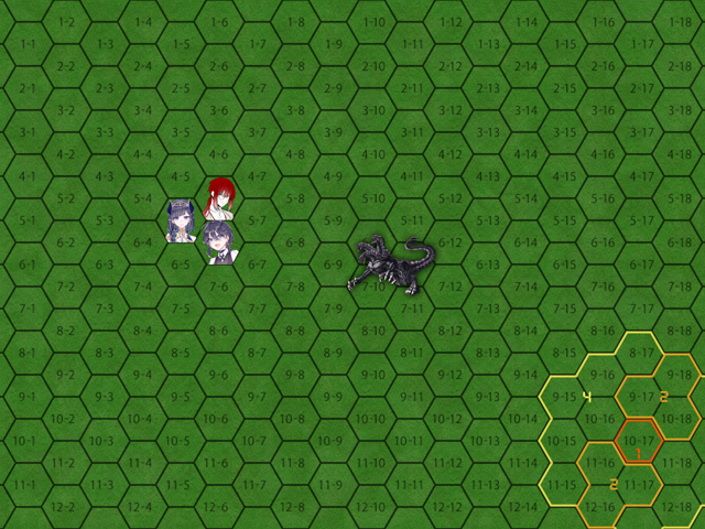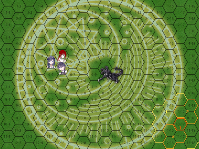 ◆勝利条件 ケルベロスを倒すこと ◆敗北条件 攻撃を防ぐのに3回失敗すること ◆基本的な進行 進行はターン制だがアルトネリコTRPGの通常の戦闘とは異なる 各ターンの最初に敵の予備動作が示される そこから繋がる敵の攻撃として3つの選択肢が現れる 正解は1つで、予備動作ごとに決められている どれが正しいかを予測し、緑魔法(場合によってはその他の手段でもよい)で防ぐ手段を考え、実行すること 防ぐのに成功した場合、直後に(誰か1名が)1回だけ攻撃できる 攻撃の手段は任意(緑魔法を含む) 累計で3回攻撃すると敵の動きが止まるので、次のターンにフィニッシュムーブを決めて倒すことができる 失敗した場合はダメージを受ける(回数制なので処理的には最大値の1/3(端数切り上げ)のダメージになる) また、種類によっては何らかの追加効果もありえる ◆ヤグシャの詠唱の効果 ヤグシャはこの戦闘中、特殊な詩魔法を詠唱する 効果は「魔法の効果を実体化する」 攻撃した回数(≒経過時間)に応じて以下のように効果が現れる(効果範囲はいずれも自陣全員) 0回:効果なし 1回:[緑魔法:物]以外でも難易度上昇なしで触れる物質を生成できる 生成できるものは属性による 2回:[緑魔法拡大]を取得している場合、拡大に伴うMP消費を無視し、射程を[射程:視界]にする 3回:緑魔法自体のMP消費を0にし、行使判定を無条件で成功させる 効果が出るタイミングはそれぞれ「攻撃の処理を行った後」となる ◆フィニッシュムーブ 実質的にはイベント展開なので任意に 1人ずつやってもいいし2人で合体攻撃でもいい ◆抵抗 直接敵をターゲットとする緑魔法は判定無しで抵抗され、全て無効化される 直接の対象でなければ問題ない ◆移動 移動は、魔法の詠唱や行使があるかどうかに関わらず、行動前に1回可能 加えて、攻撃をする人は攻撃前と後に追加で1回ずつ移動可能 1回の移動可能距離は【移動力】マスまでとする なお、1マス=1mとする ◆射程 敵の攻撃の射程は攻撃の種類ごとに異なる 緑魔法の射程はルールに準ずる それ以外の攻撃の射程は特になにもなければ1とする ◆かばう 攻撃を防ぐのに失敗し、かつヤグシャが攻撃の対象に含まれる場合、強制でかばうことになる 二人のうちどちらがかばうかは任意、距離も考慮しない ダメージの処理は本体ルールと同じ かばう先が受けるはずだった攻撃のみを受ける ヤグシャが攻撃の対象に含まれない場合は、残りの二人の間でかばうこともできる 処理は同様